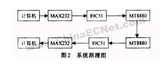 2 系统硬件设计 2.1 系统组成 系统由发送和接收2大部分组成。如图2所示。实现PC机的两机间的通信步骤如下: (1)将PC的信号与串口芯片的MAX232相连,将PC中的电平信号通过MAX232实现电平转换。 (2)将从MAX232中转换出来的信号接入89C51中进行处理,将出来的信号引入DTMF芯片MT8880中进行编码,编码后的信号经由普通的电缆线与另一个MT8880芯片进行连接,由MT8880进行解码处理。 (3)将解码后的信号接入89C51中进行处理。 (4)从89C51出来的信号再次经过串口芯片MAX232进行电平转换,将转换后的信号接入计算机的串口后就实现了两机的通信。